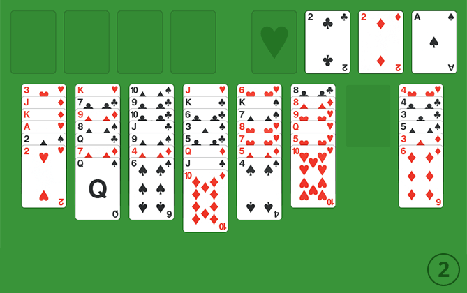 Als we geen andere mogelijkheden meer zien op het tableau dan gaan we onze eerste vrije cel gebruiken als tijdelijke opslagruimte. We zien in kolom 1 dat er een aas ligt met daar bovenop 2 tweeën, en deze kunnen we nergens kwijt. We gaan deze verplaatsen naar de 2 vrije cellen. Eigenlijk hoeven we alleen de harten 2 hier maar naartoe te verplaatsen (zie afbeelding 3) aangezien het spel de schoppen 2 zelf weer opruimt (omdat de schoppen aas al aanwezig is op de foundation).